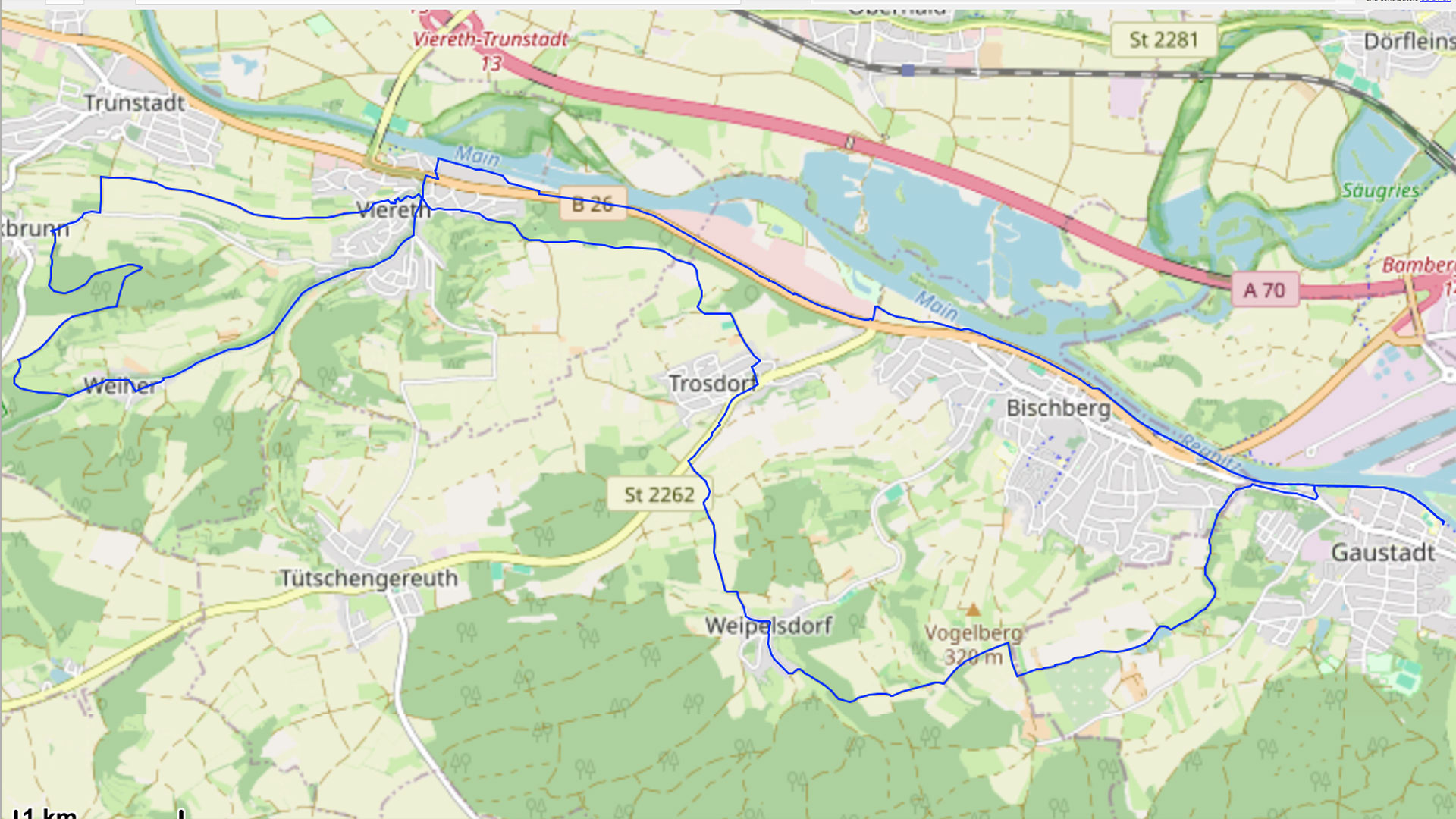 Wir starten an der Schwarzen Brücke in Gaustadt und laufen Richtung Bischberg. Entlang des Röthelbach geht es zum Kühsee und weiter nach Weipelsdorf, von wo aus wir über die Flur nach Trosdorf laufen. Hoch über dem Maintal führt uns die Route weiter nach Viereth und fast bis Trunstadt. Bei Stückbrunn kehren wir um und laufen über Weiher zurück nach Viereth und weiter auf dem Main-Radweg zum Ausgangspunkt zurück.