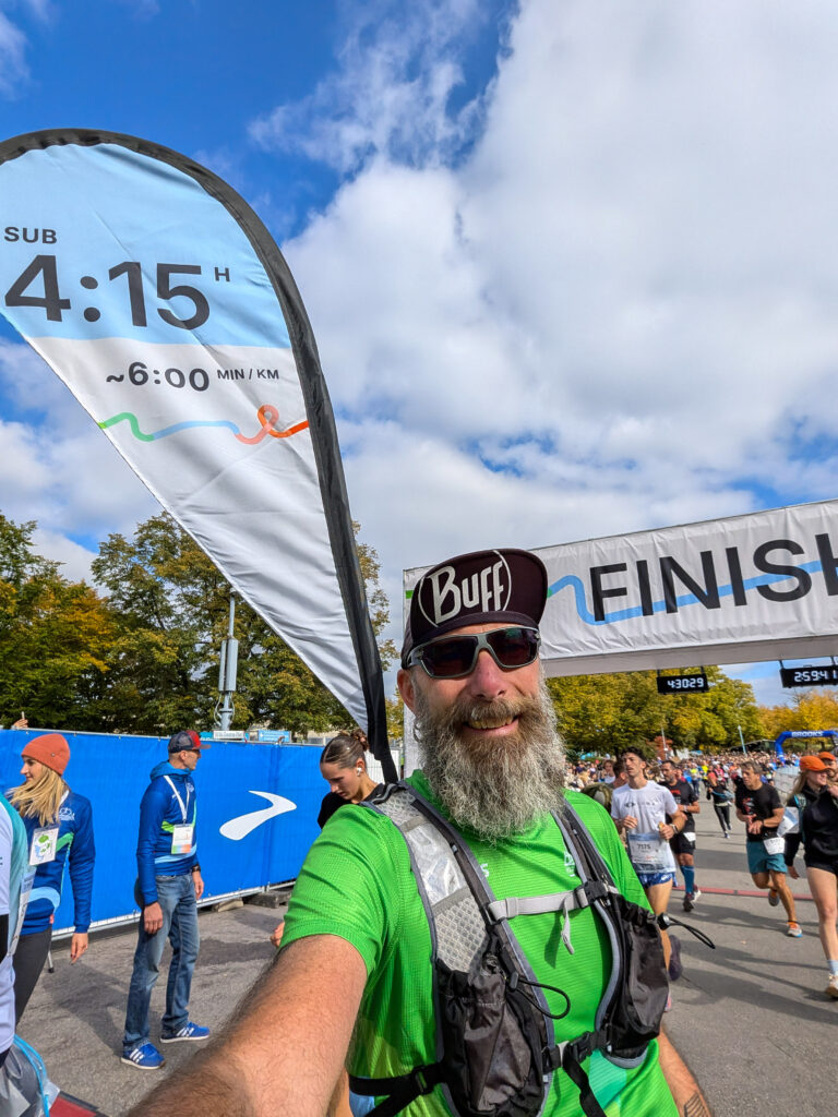 Bernd war als Pacer für sub 4:15 am Start. Bei besten Bedingungen lief er nach 4:12.59 Std. im Olympiapark über die Ziellinie.